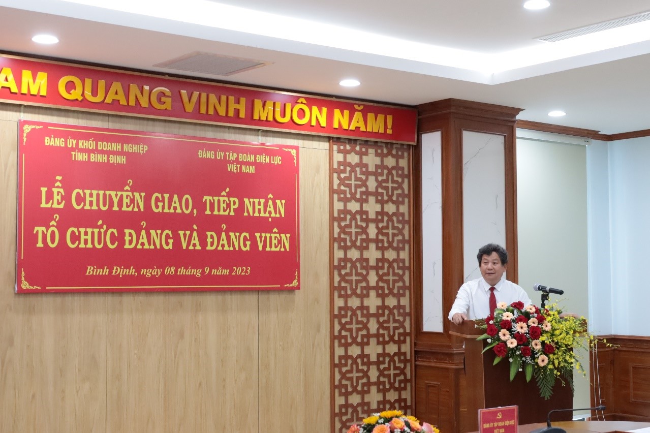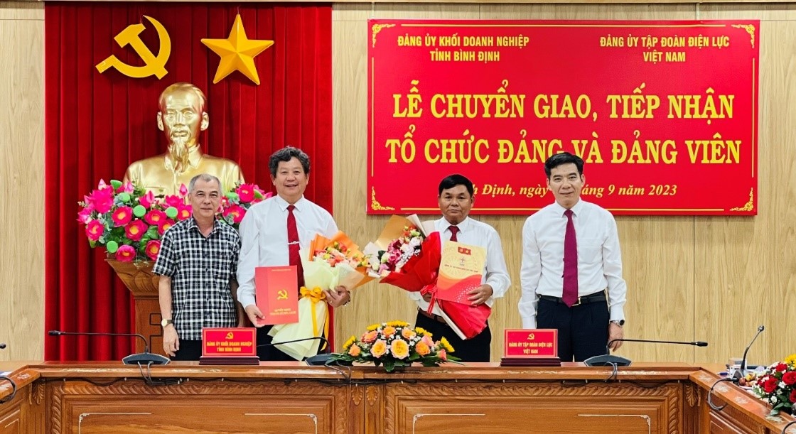 Đồng chí Phạm Vĩnh Thái - Tỉnh ủy viên, Phó Trưởng ban Thường trực Ban Tổ chức Tỉnh ủy Bình Định và đồng chí Nguyễn Hữu Tuấn – Phó Bí thư Thường trực Đảng ủy EVN trao quyết định, biên bản chuyển giao, tiếp nhận Đảng bộ cơ sở AKKN
