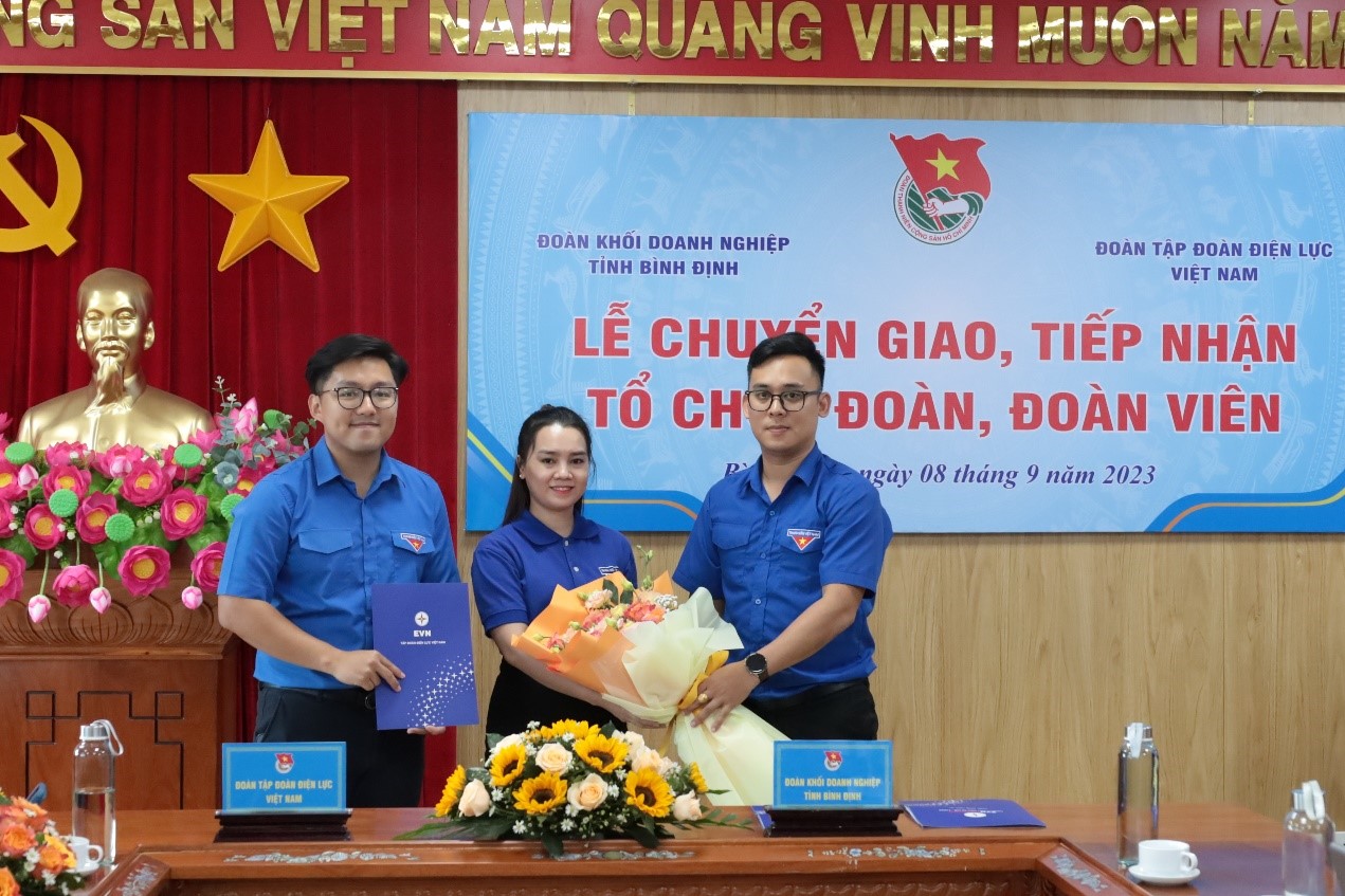 Đồng chí Dương Thái Anh - Ủy viên BCH Trung ương Đoàn, Ủy viên BCH Đoàn khối Doanh nghiệp Trung ương, Bí thư Đoàn TNCS Hồ Chí Minh EVN và đồng chí Bùi Lê Khánh – Bí thư BCH Đoàn KDN tỉnh Bình Định trao quyết định chuyển giao và tặng hoa cho đồng chí Kiều Trang – Bí thư Đoàn cơ sở AKKN