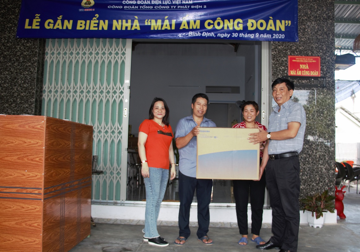 Ông Nguyễn Văn Cương – Chủ tịch Công đoàn Công ty Thủy điện An Khê – Ka Nak trao quà mừng Mái ấm công đoàn cho gia đình anh Thanh