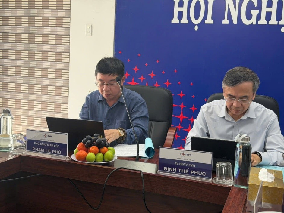 Ông Phạm Lê Phú – Phó Tổng Giám đốc EVN (bên trái); ông Đinh Thế Phúc – Thành viên HĐTV EVN (bên phải) trong buổi làm việc tại Trụ sở Công ty