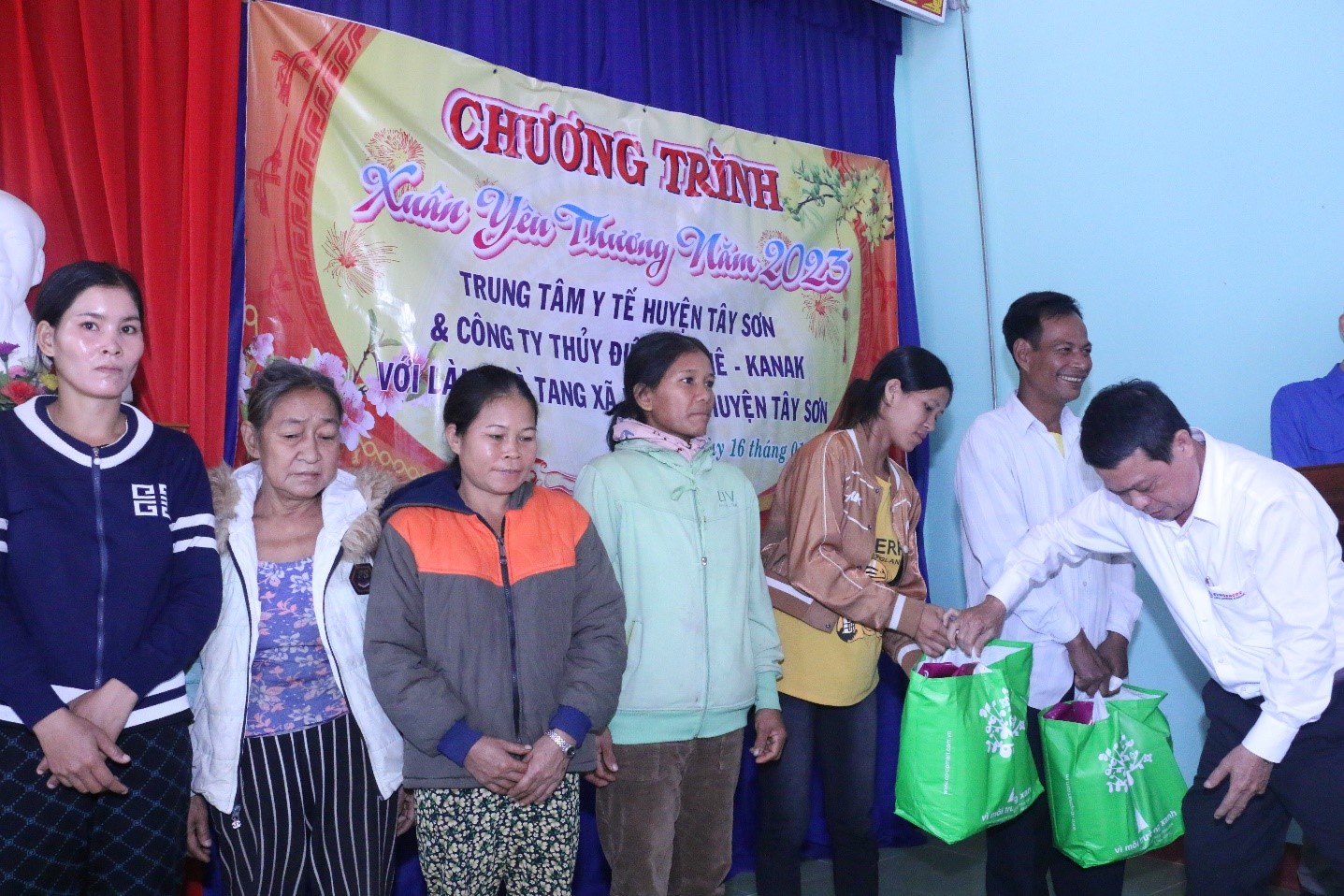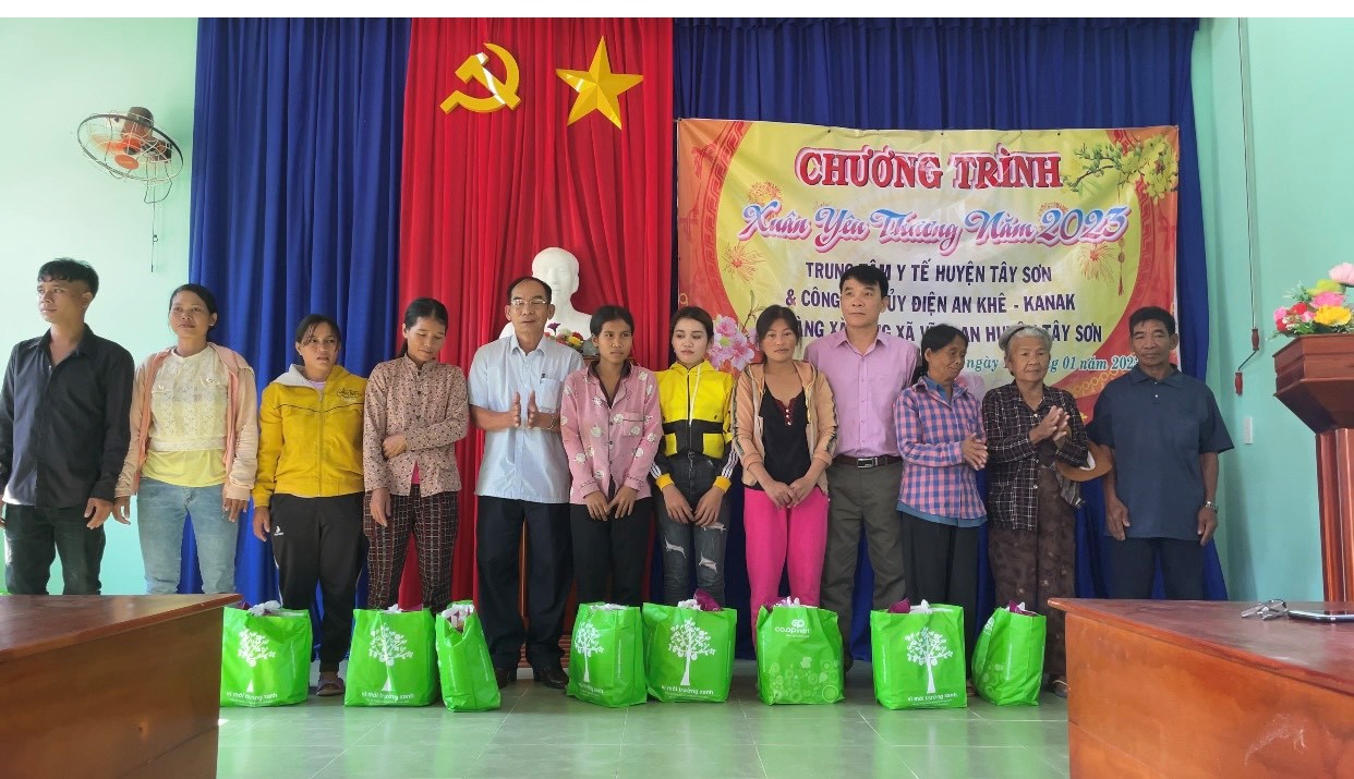 Tại chương trình “Xuân yêu thương” 2023, đồng chí Đỗ Đức Hoài – Phó Giám đốc Công ty Thủy điện An Khê - Ka Nak cùng đại diện Trung tâm Y tế huyện Tây Sơn đã trao tặng 80 phần quà tết cho bà con làng Xà Tang bao gồm gạo, dầu ăn, nước mắm, bột ngọt, sữa. Tổng giá trị chương trình gần 20 triệu đồng được trao tặng từ nguồn đóng góp của cán bộ công nhân viên Công ty Thủy điện An Khê - Ka Nak.