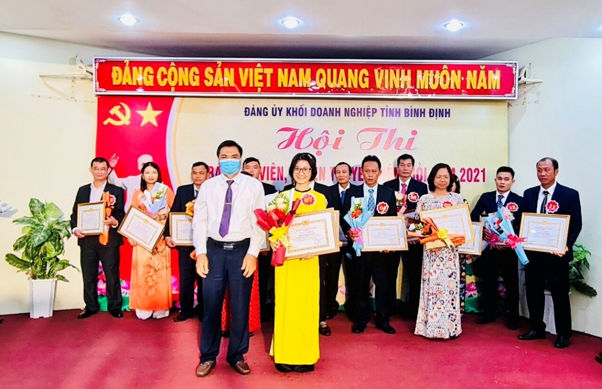 Chị Dương Thị Thu Hoài – Chuyên viên Phòng Hành chính - Lao động (áo dài vàng) đạt giải Nhất cấp Khối Doanh nghiệp và giải Ba cấp tỉnh Bình Định tại Hội thi báo cáo viên, tuyên truyền viên giỏi năm 2021