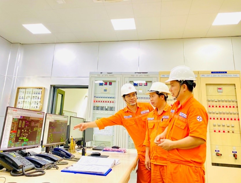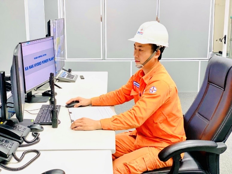 Trưởng ca Võ Doãn Khánh (ngoài cùng bên phải) trong giờ làm việc tại Phân xưởng Vận hành Nhà máy Thủy điện An Khê