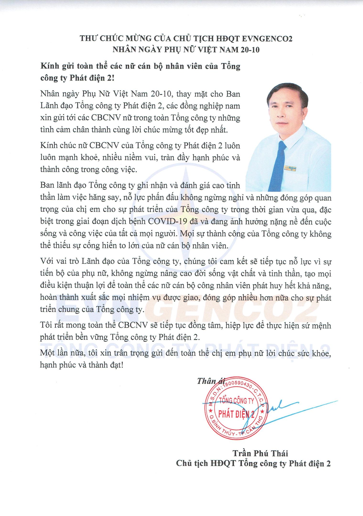 Thư chúc mừng của Chủ tịch HĐQT EVNGENCO2 nhân ngày Phụ nữ Việt Nam 20-10