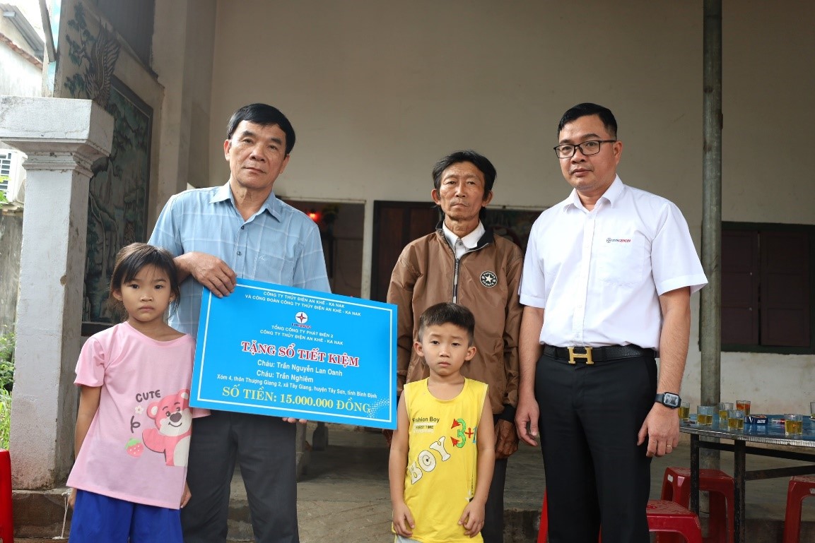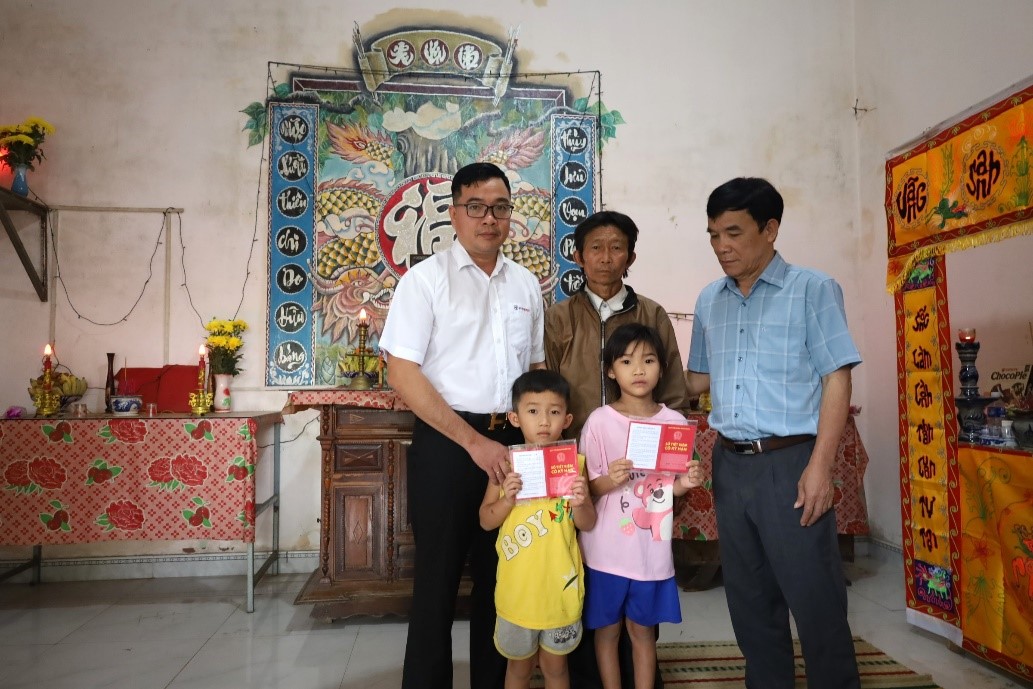 Ông Đỗ Đức Hoài - Phó Bí thư Đảng ủy phụ trách Đảng bộ Công ty, Phó Giám đốc (bìa phải), ông Đặng Quốc Anh – Chủ tịch Công đoàn (bìa trái) trực tiếp tặng sổ tiết kiệm cho hai cháu nhỏ con của vợ chồng anh Xí trước sự chứng kiến của chính quyền địa phương, bà con lối xóm