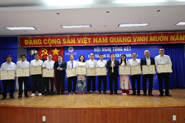 Tập thể Chi bộ 2 (trái) và các đảng viên trong Đảng ủy Công ty (phải) được nhận Giấy khen Hoàn thành xuất sắc nhiệm vụ năm 2024
