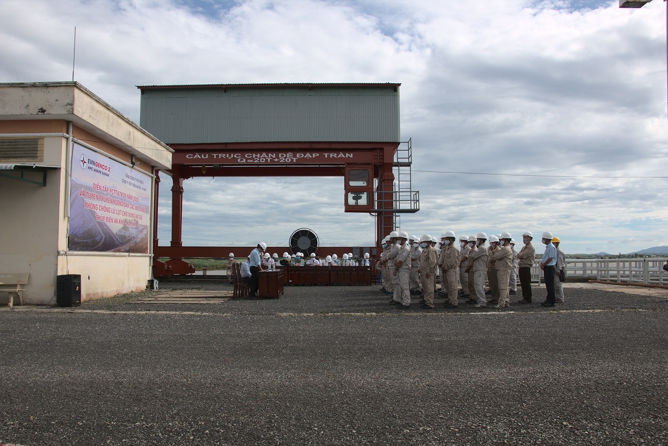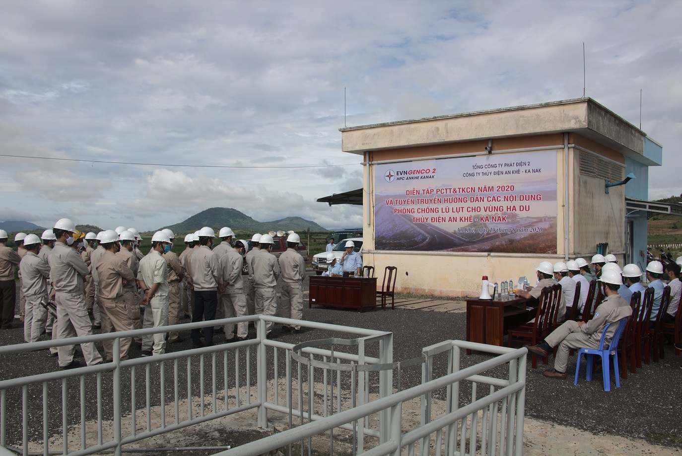 Phương án diễn tập PCTT&TKCN năm 2020 đưa ra tình huống giả định là: Do ảnh hưởng của áp thấp nhiệt đới, trên lưu vực hồ chứa Thủy điện An Khê - Ka Nak xảy ra mưa lớn cộng gió giật mạnh làm sóng vỗ gây trượt sạt đá gia cố mái đập thượng lưu bờ trái đập dâng An Khê; lượng mưa bình quân trong 24 giờ qua trên lưu vực hồ chứa là 70mm, dự báo trong 24 giờ tới, mưa to còn tiếp diễn, lượng mưa bình quân trên lưu vực là 100 mm, lưu lượng nước trung bình về hồ chứa 500-700m3/s. Ca trực vận hành đập tràn thực hiện nâng các cửa van cung nhưng khi đang thao tác cửa van cung số 1 thì bị sự cố không thể tiếp tục vận hành. Đồng thời, trong quá trình thao tác nâng cửa van cung xả thì mất điện lưới địa phương 22 kV tại đập, phải chuyển sang nguồn điện của máy phát điện diesel dự phòng 1. Khi thực hiện chuyển đổi máy phát điện dự phòng 1 báo sự cố, phải chuyển sang máy phát điện diesel dự phòng 2.