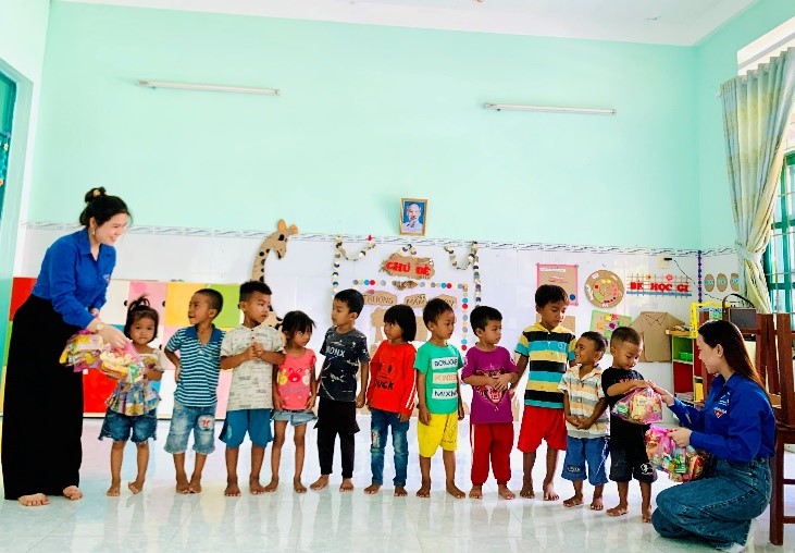Tặng quà cho các cháu Trường mầm non và tiểu học ở điểm làng Xà Tang